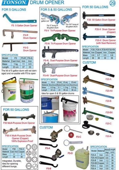 Steel, Drum Opener / Drum Deheader | Drum Opener / Drum Deheader (Hardened Steel Blade) | Non-Spark Drum Opener, (Non-sparking Blade) | 100% Non-Spark Drum Opener (completely non-sparking) | Wider cut, Clean edge. About 28 cuts to top off the drum. | |