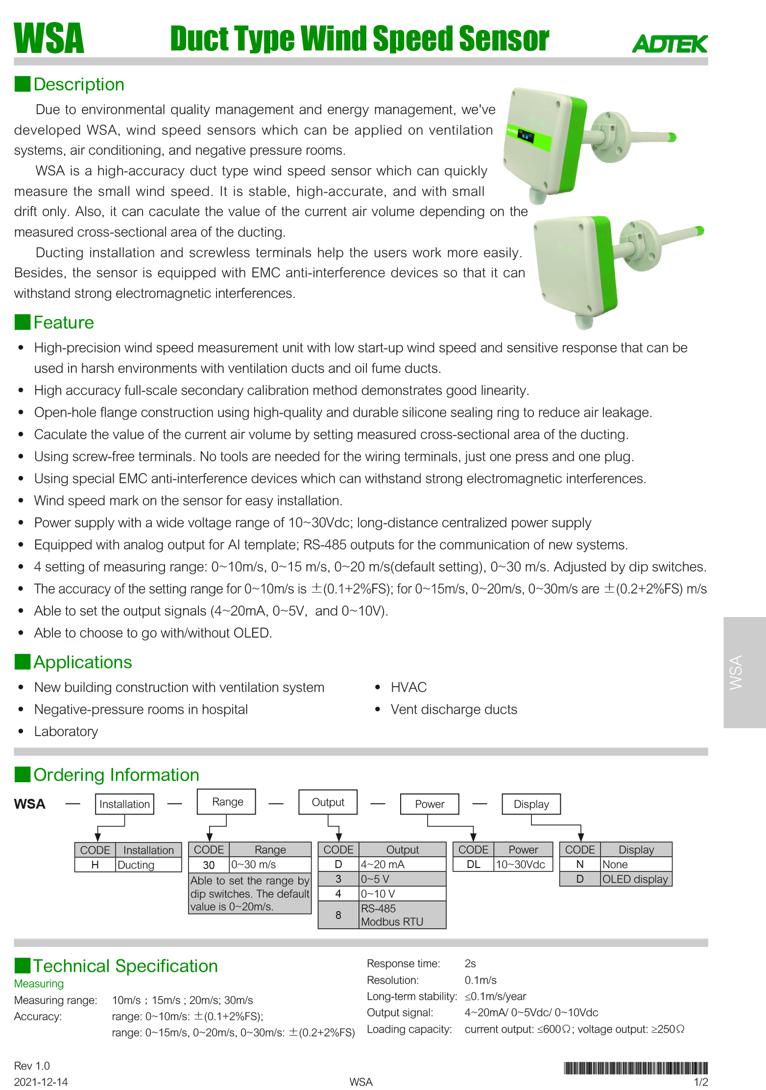 WSA●Duct Type wind speed sensor●Duct Type Air Velocity Transmitter●에어 풍속계,에어 풍속 트렌스 메타●에어 풍속측정기,에어풍속트렌스메타●에어속도계,에어풍속즉정기●덕트형풍속계●덕트형풍속센서●풍량계●풍속테스터기●스틱형풍속계●휴대용디지털풍속계●휴대용 디지털 풍량계●드론풍속계,드론풍량계●풍속측정기●(ADTEK)